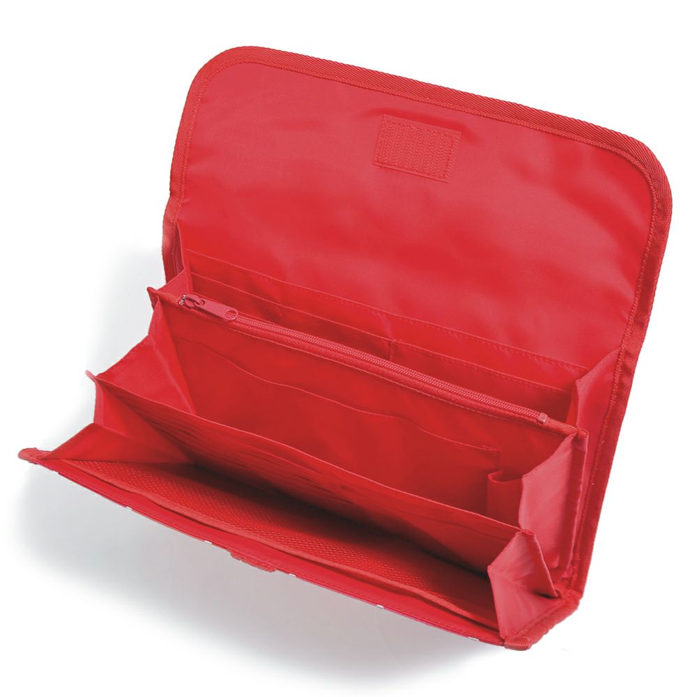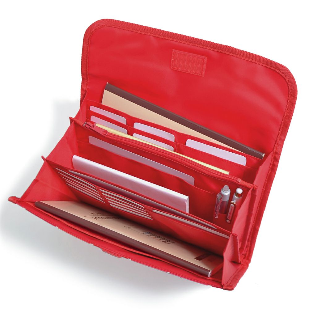 貴重品を収納できるファスナー付きポケットやカードポケット、ペンホルダー、中身が確認できるメッシュポケットなど小分けに便利なポケットが満載です。