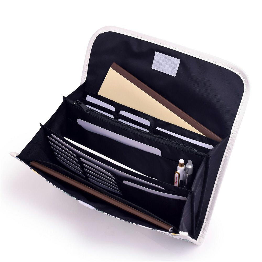 貴重品を収納できるファスナー付きポケットやカードポケット、ペンホルダー、中身が見えるメッシュポケットなど小分けに便利なポケットが満載。