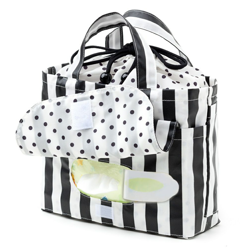 Sサイズのおむつ4~5枚と、70枚程度のおしりふきなど、おむつ替えに必須のアイテムをひとまとめに持ち運べる巾着型トートです。