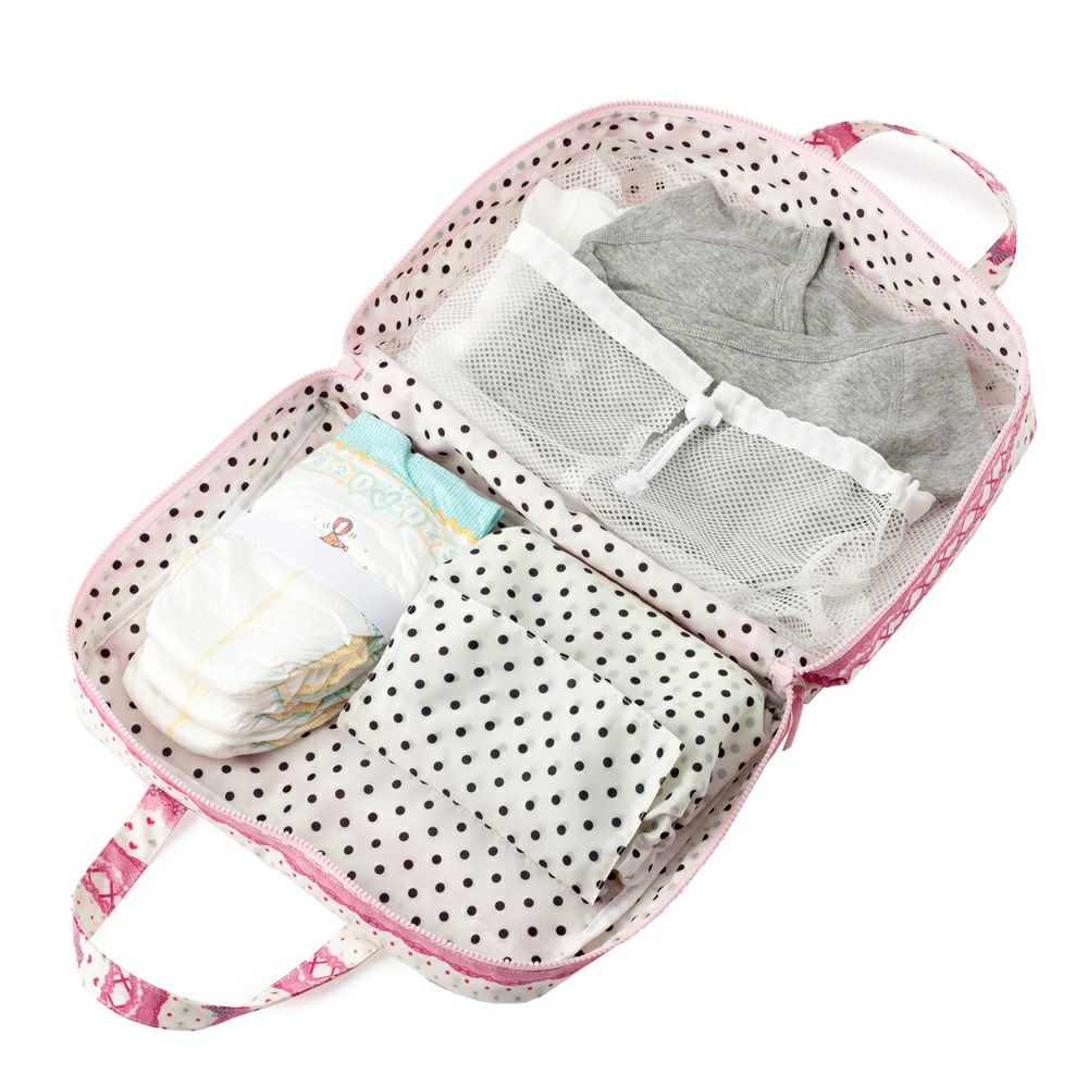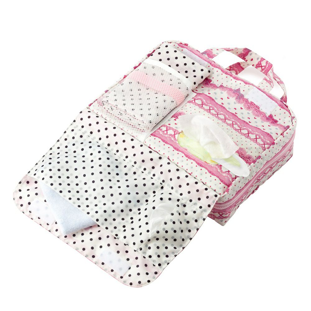 おしりふきやおむつが入るポケットや、衣類などを収納できるメッシュ巾着など、機能的で便利なポケットが満載。外出に必須のアイテムをすっきり収納します。