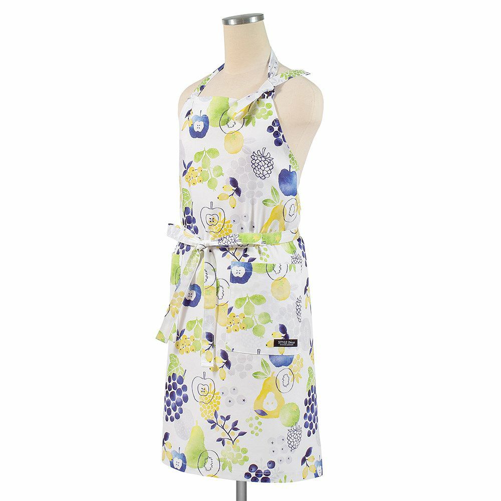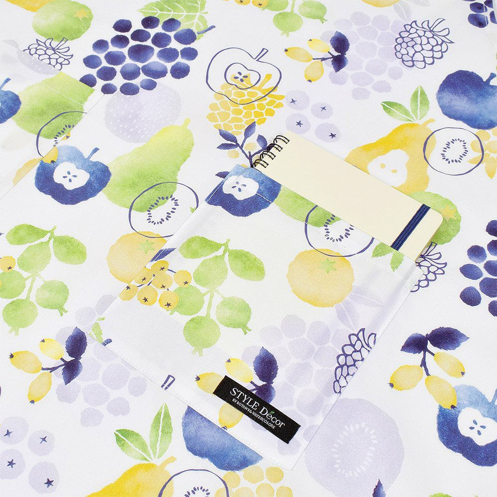 洋なしや林檎など、収穫期を迎えた丸みのある可愛いフルーツがたくさん描かれたポップなデザイン。水彩画タッチの優しさと、ブルー、グリーン、黄色の独特な色使いも魅力的です。
