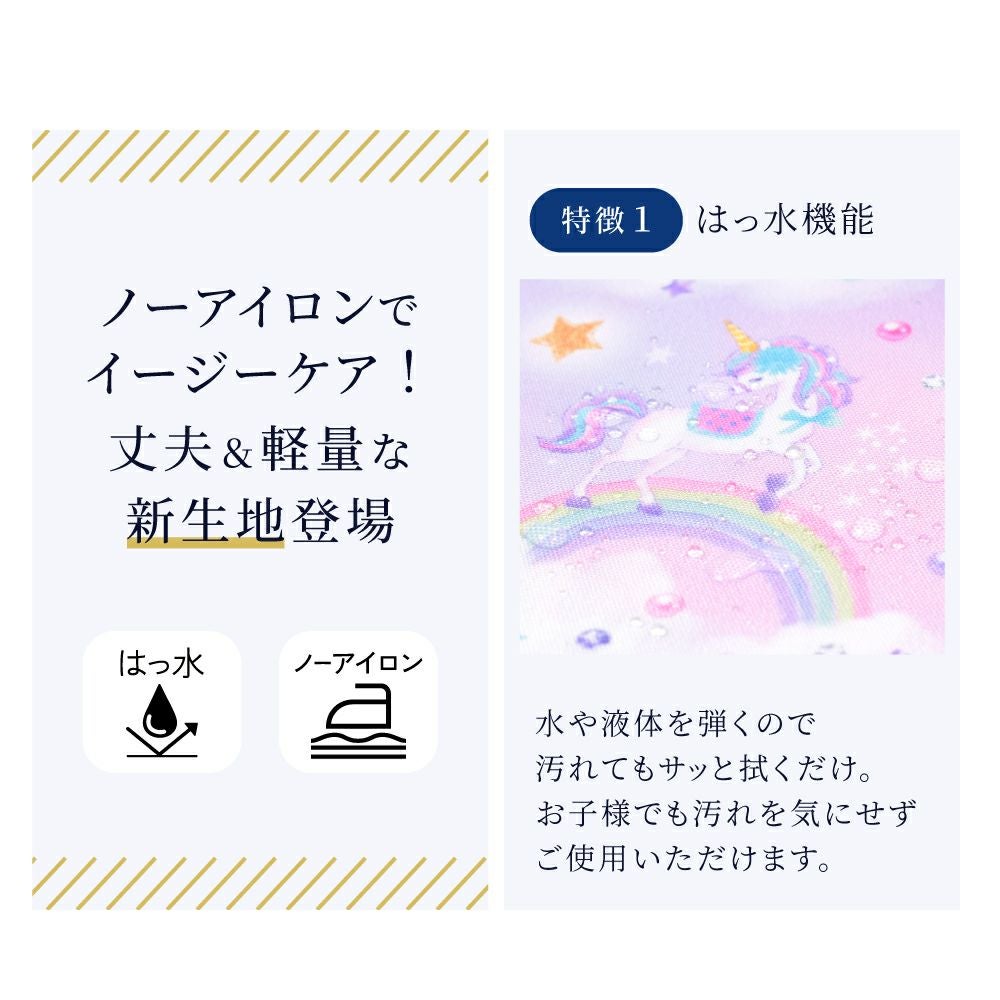 水や液体が表面に弾いて滑り落ちるはっ水機能。調理実習やお手伝いなど、調理中や食べこぼしの汚れを防ぎ、汚れてもサッと拭くだけお手入れ簡単です。