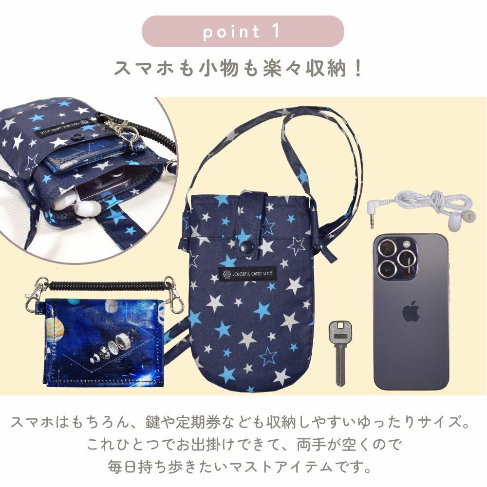 携帯、お財布、ハンカチ、お菓子や鍵、イヤホンなどの小物を収納、オープンポケットにはパスケースも収納可能。これひとつでお出掛けできて、両手が開くので、毎日持ち歩きたいマストアイテムです。