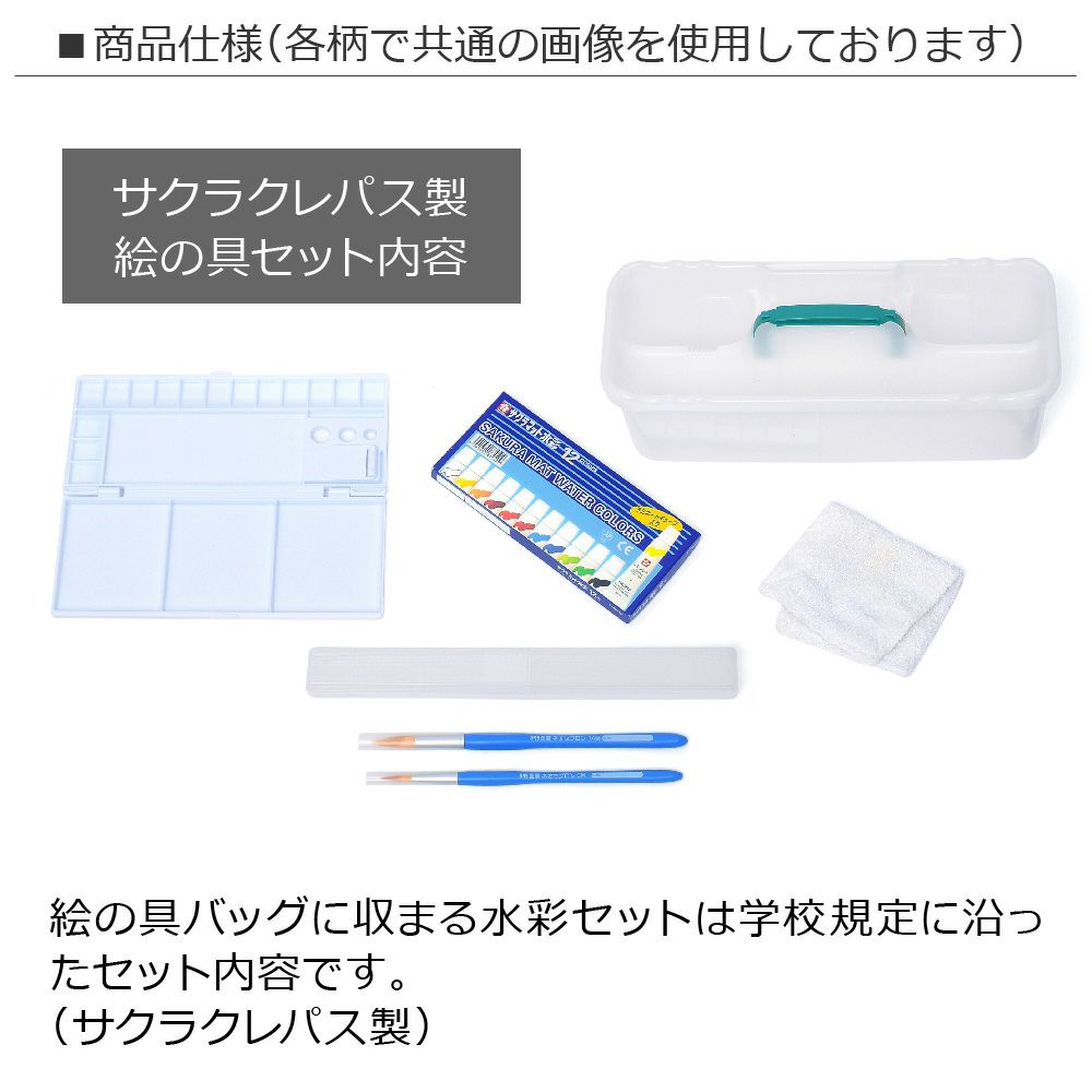 セット内容:画材・絵の具バッグ(ショルダーベルト付)、マット水彩12色ラミネートチューブ入(5ml)、パレット15色用、角型筆洗 E(大型)、筆拭きぞうきん、画筆ネオセブ ロン丸型(細・太)、筆筒