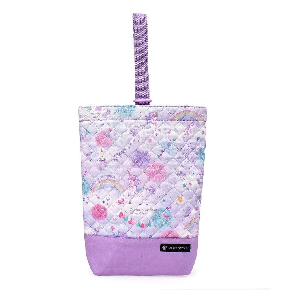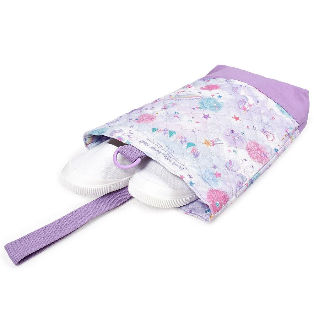 持ち手をDカンに通して袋口を締める簡単開閉タイプ。子どもが自分で収納でき、靴もずり落ちません。