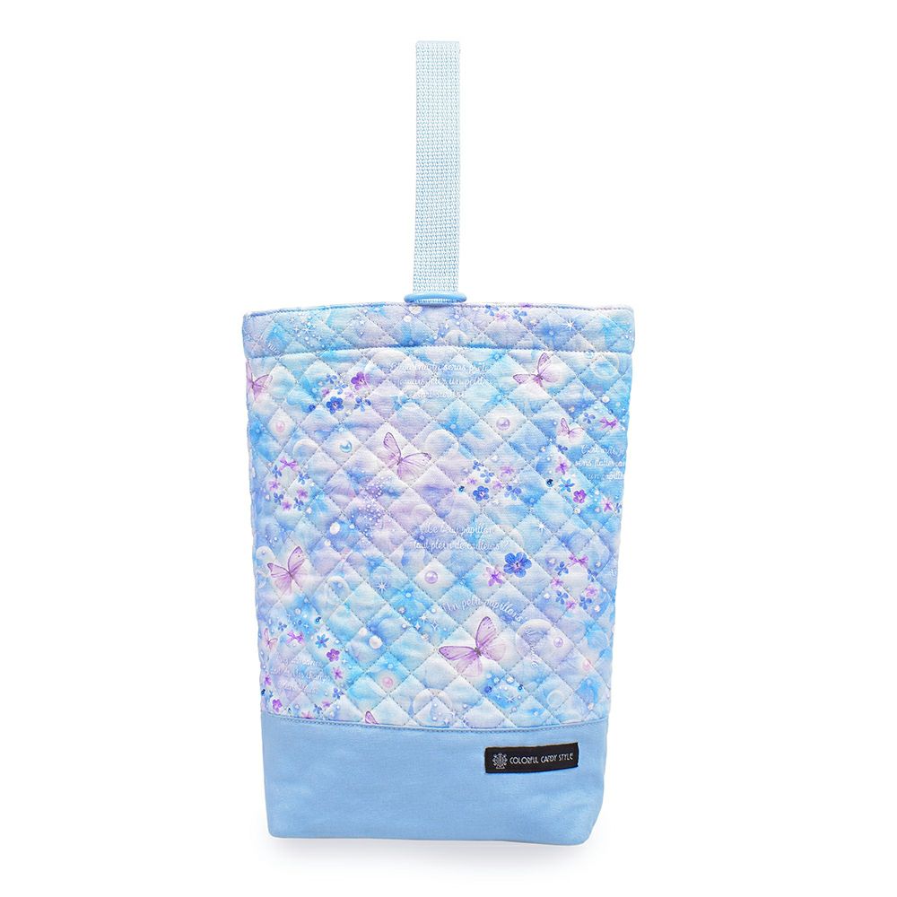 持ち手をDカンに通して袋口を締める簡単開閉タイプ。子どもが自分で収納でき、靴もずり落ちません。