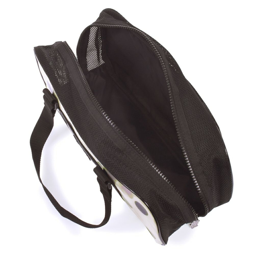 左右に大きく開く両開きファスナー仕様。ゆったりサイズ設計なので中身も出し入れしやすいです。プライバシーに配慮し、ネームタグは内側に付いています。