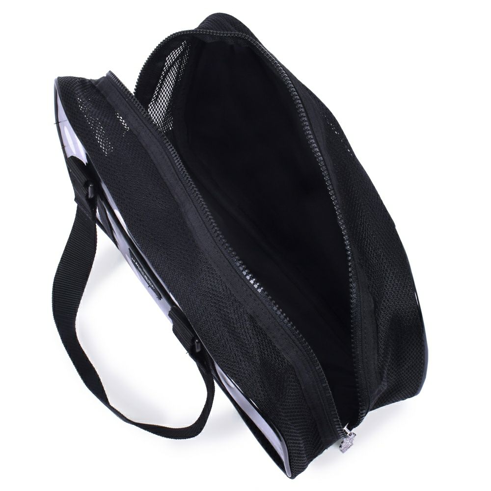 左右に大きく開く両開きファスナー仕様。ゆったりサイズ設計なので中身も出し入れしやすいです。プライバシーに配慮し、ネームタグは内側に付いています。