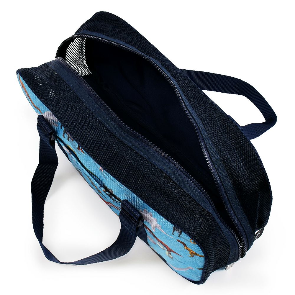 水彩絵の具12色セットやパレット、筆、筆洗いなど美術の授業や図画工作に欠かせない道具がすべてそろっています。バッグは左右に大きく開く両開きファスナー仕様。ゆったりサイズ設計なので中身も出し入れしやすいです。プライバシーに配慮し、ネームタグはブランドタグの裏側に付いています。さらに長さ調節が可能なショルダーベルト付きなので肩掛けもOK。