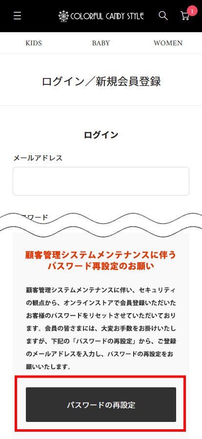 メンテナンスに伴い、セキュリティの観点から、オンラインストアで会員登録いただいたお客様のパスワードをリセットさせていただいております。