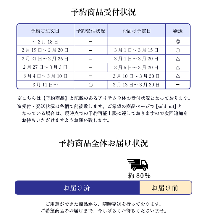 ご予約商品の進捗をタイムリーにご覧いただけるよう、「予約商品受付状況」に受付状況やお届け予定日についてのご案内を追加いたしました。